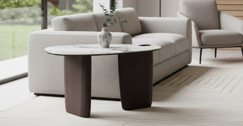 Bàn góc Nor Đa sắc - Sở hữu thiết kế độc đáo với mặt bàn hình oval đối xứng bằng đá cẩm thạch trắng vân nâu tinh tế, kết hợp cùng chân trụ gỗ tối màu chắc chắn, chiếc bàn này là tuyên ngôn hoàn hảo cho phong cách sống hiện đại và sang trọng, lý tưởng để tạo điểm nhấn trong không gian phòng khách.