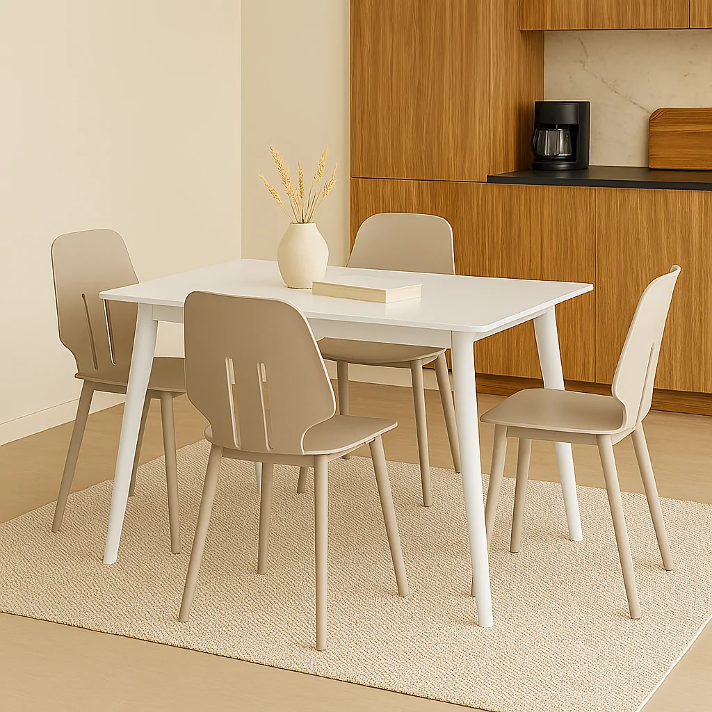 Thiết kế tối giản, chân gỗ chắc chắn mang lại sự thoải mái và phong cách, lý tưởng cho những bữa ăn gia đình hoặc gặp gỡ bạn bè trong không gian sáng sủa và tinh tế.