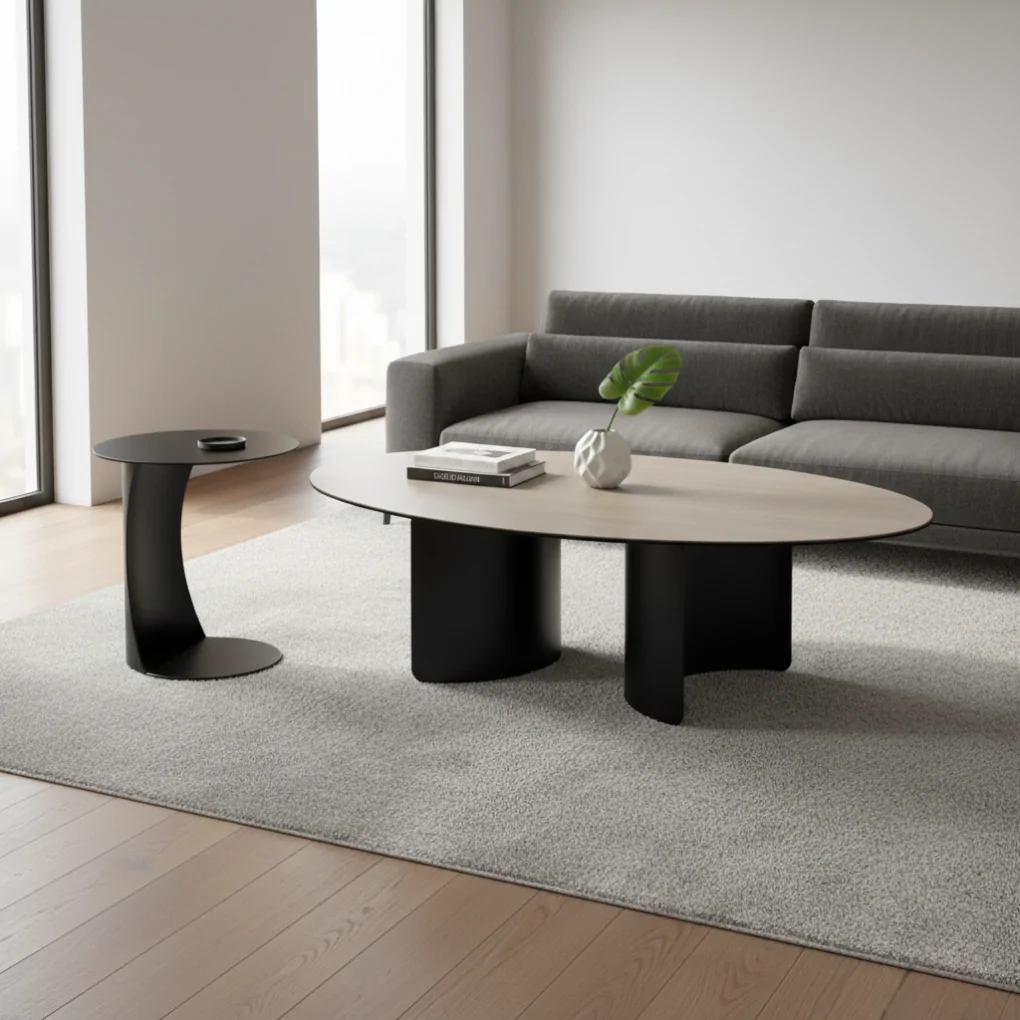 Mặt bàn hình elip với các góc bo tròn, làm từ chất liệu cao cấp mang lại cảm giác ấm áp, tự nhiên.