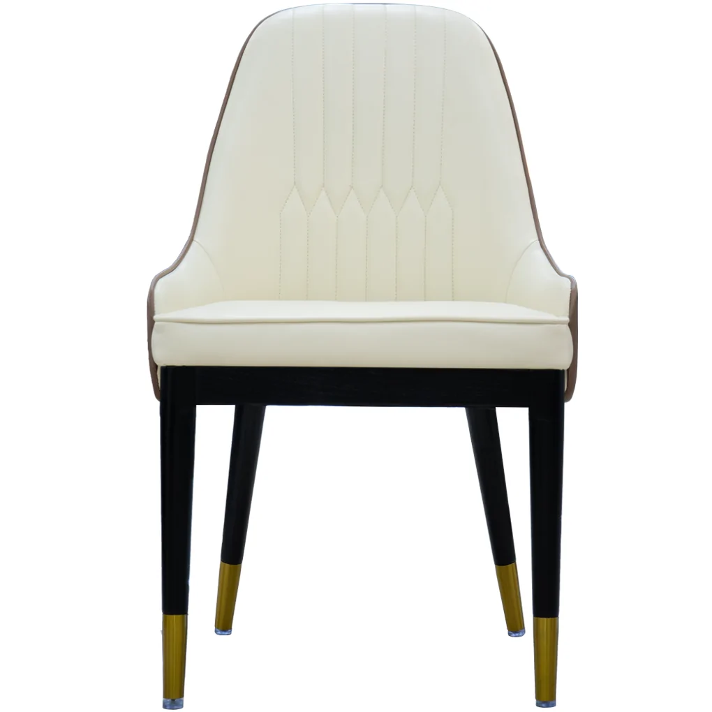 Chân ghế có cấu tạo vững chắc các mối nối kết nối linh hoạt, dưới mỗi thân ghế được bọc thêm kim loại ánh vàng vừa làm tăng giá trị thẩm mỹ của sản phẩm vừa bao bọc bảo vệ chân ghế. Bốn chân ghế đều được gắn thêm một lớp cao su nhựa trong suốt giúp hạn chế trầy xước nền nhà và giúp hạn chế trơn trượt khi ngồi.