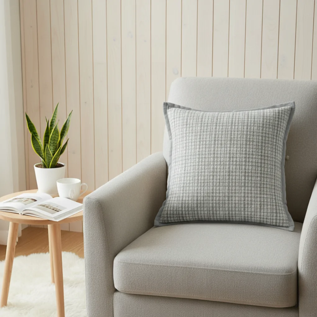 Sự kết hợp giữa họa tiết kẻ ô cổ điển, chất liệu dệt ấm áp và đường viền sắc nét là những yếu tố khiến chiếc gối này trở nên đặc biệt và thu hút.