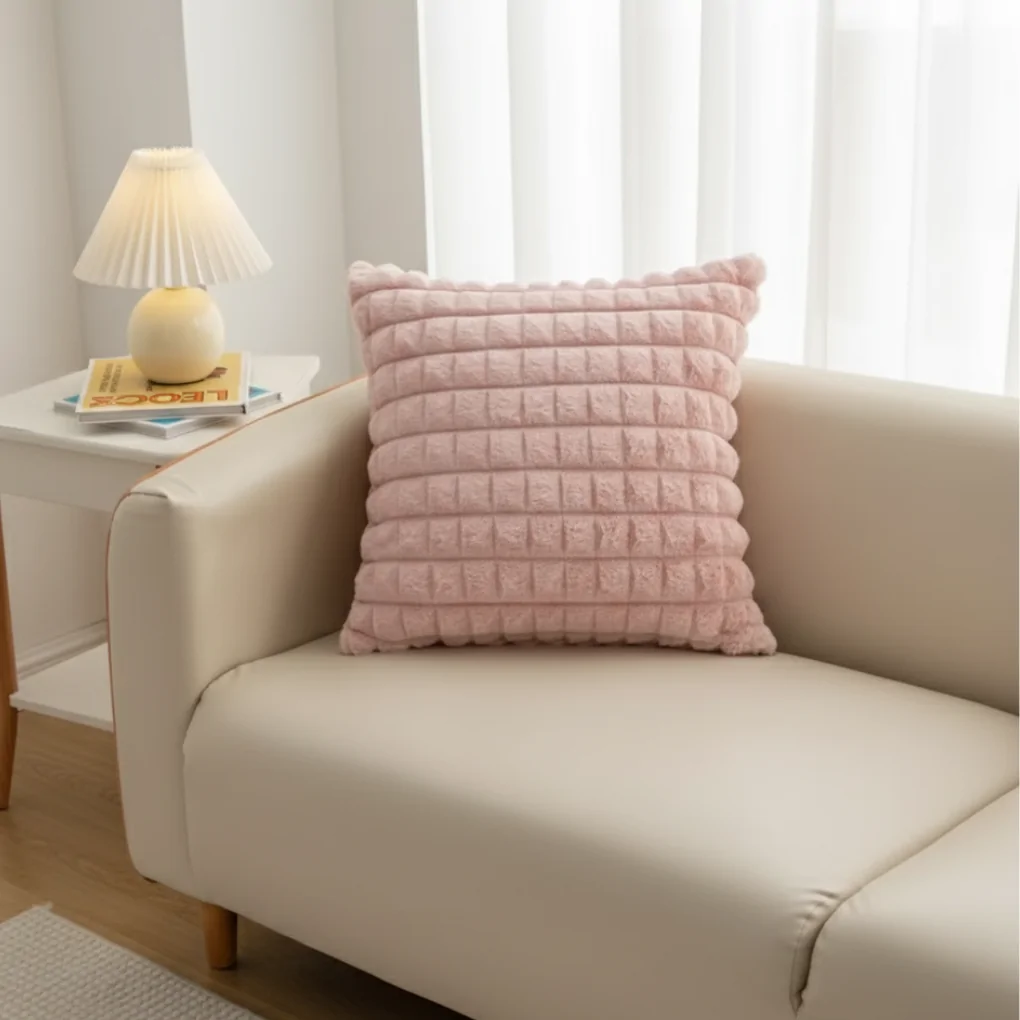 Điểm nổi bật nhất là họa tiết ô vuông. Các đường may hoặc nếp dập nổi chạy ngang và dọc tạo ra hiệu ứng 3D và chiều sâu, khiến chiếc gối không bị đơn điệu.
