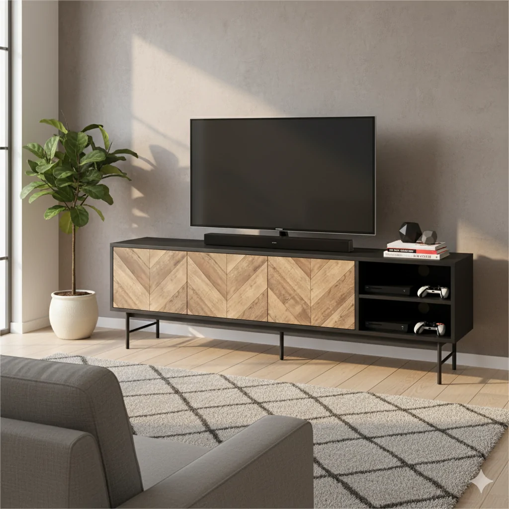 Sự kết hợp giữa tông màu đen sang trọng và họa tiết vân gỗ xương cá trên mặt tủ tạo nên vẻ ngoài ấn tượng, thu hút mọi ánh nhìn.