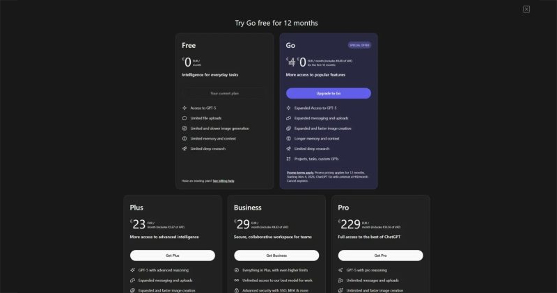 Bước 3: Quay lại đầu trang → Chọn ChatGPT Go → Nhấn "Upgrade to Go". Bạn sẽ thấy hiển thị giá 4 EUR/tháng và dòng “12 Months Free Trial”.