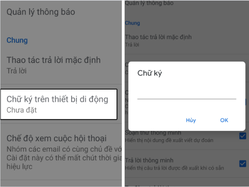 Mở ứng dụng Gmail > Ở góc trái trên cùng, chọn vào Menu (3 gạch ngang) > Kéo xuống chọn Cài đặt > Chọn Tài khoản Google cần thêm chữ ký > Nhấn vào Chữ ký > Nhập văn bản cho chữ ký > Nhấn OK.