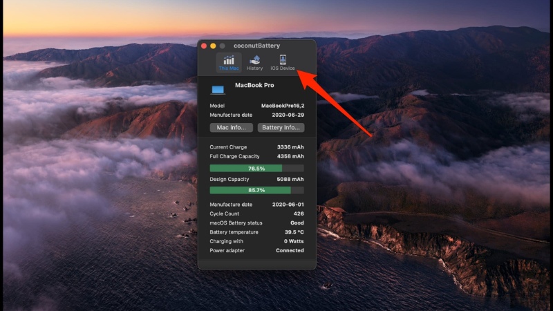 Bước 3: Mở ứng dụng CoconutBattery trên Macbook và chọn iOS Device để tiến hành kiểm tra pin cho iPad.