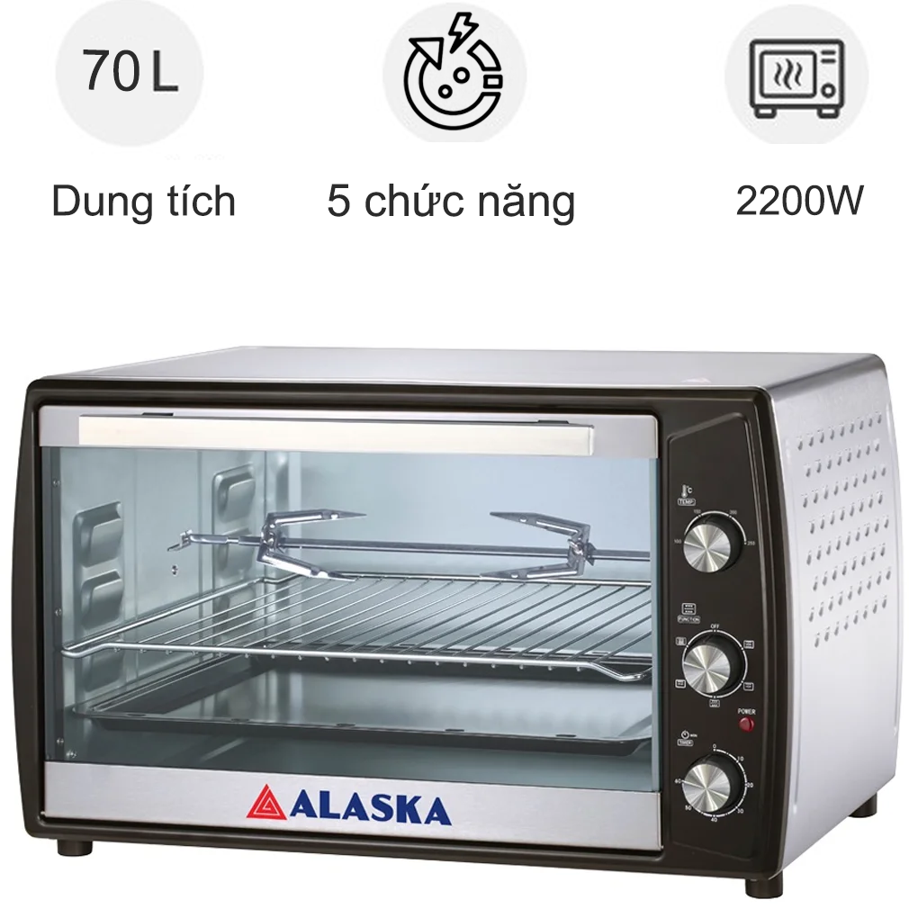 Lò Nướng Điện Alaska KW-70C 70 Lít công suất đến 2200W; dung tích lò nướng 70L, chứa được nhiều thực phẩm, phù hợp cho các gia đình có đông thành viên và thường có những buổi tiệc hoặc các quán ăn.