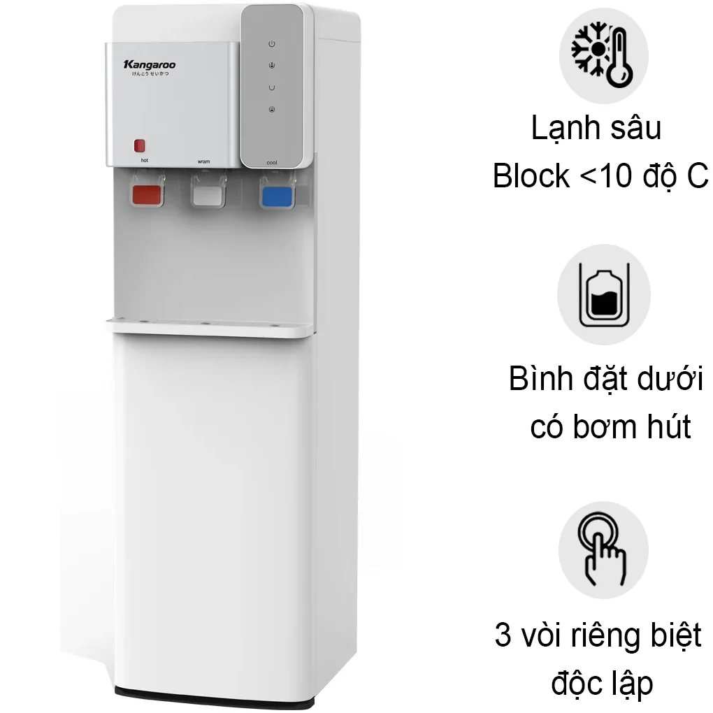 Máy làm nóng lạnh nước Kangaroo KG63A3 không chỉ gây ấn tượng bởi thiết kế hút bình âm hiện đại, mà còn nổi bật với tính năng an toàn và công nghệ làm lạnh Block tiên tiến. Nếu bạn đang tìm kiếm một sản phẩm đa năng, thẩm mỹ và tiết kiệm năng lượng cho gia đình hoặc văn phòng, Kangaroo KG63A3 chính là lựa chọn lý tưởng.