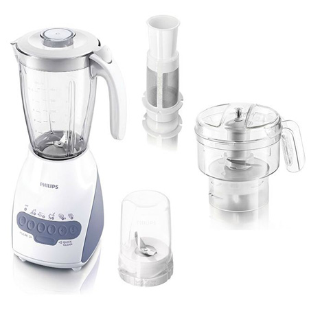 Máy xay trái cây PHILIPS HR2118 gọn nhẹ kèm 3 cối xay bằng nhựa cao cấp, có màu trắng tinh khiết điểm sắc tím vô cùng sang trọng, phù hợp với không gian bếp nhà bạn.