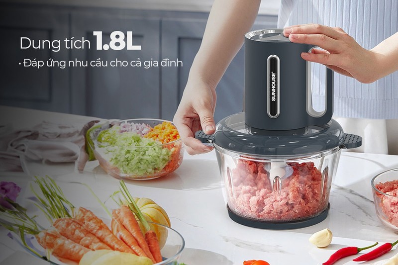 Máy xay thịt thương hiệu Sunhouse có dung tích cối xay 1.8 lít có thể xay khoảng 2 lạng thịt trong một lần.