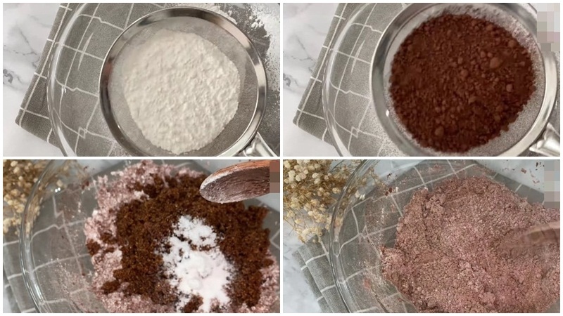 Trước tiên, trộn các nguyên liệu khô: rây bột mì, bột ca cao, baking soda và muối vào một tô rồi trộn đều. Ở một tô khác, đánh bơ lạt mềm với đường bột bằng phới lồng cho thật mịn (không cần đánh bông quá). Thêm 2 lòng đỏ trứng (để lạnh) cùng tinh chất vani vào tô bơ, khuấy đều.