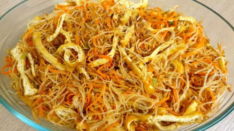 Chả chay đem thái thành sợi mỏng vừa ăn. Có thể làm sẵn trong lúc chờ các thành phần khác nguội để tiết kiệm thời gian.