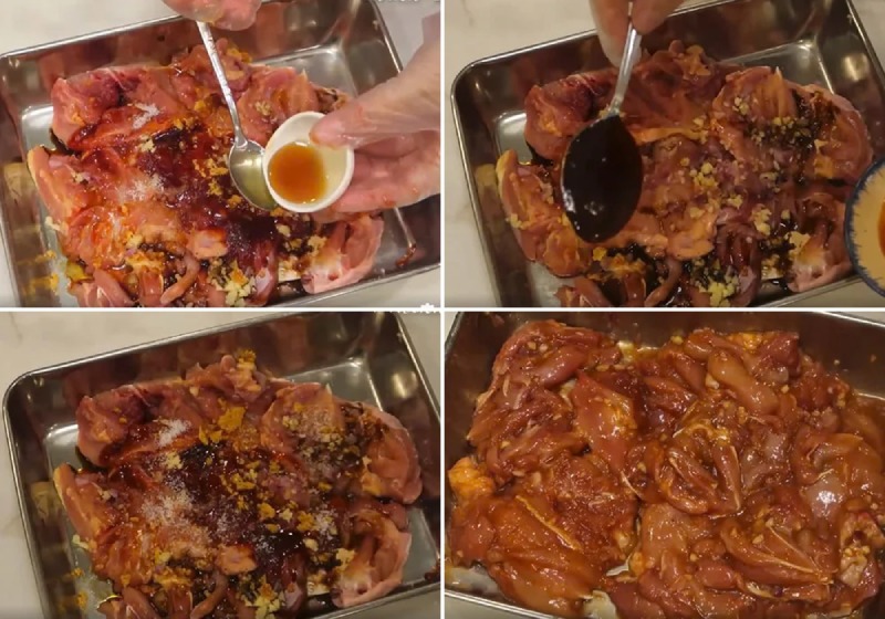 Đặt thịt gà vào khay hoặc tô lớn, cho các gia vị (nước tương, dầu hào, đường nâu, ngũ vị hương, nước mắm, hạt tiêu, nước lọc, hành, tỏi băm) vào, trộn đều để gia vị phủ đều thịt.