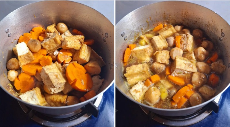 Bước 4: Kho hỗn hợp đậu hũ và rau củ