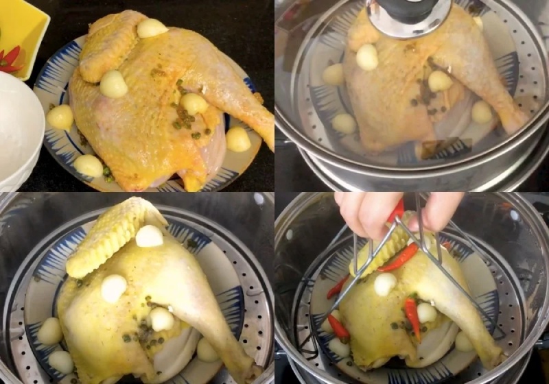 Bắc nồi hấp lên bếp, thêm 1.5 lít nước lọc, xếp gà vào nồi, hấp 35 - 40 phút đến khi gà mềm.