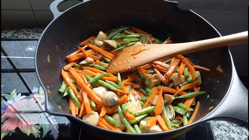 Dùng lại chảo vừa chiên, cho rau củ vào xào với lửa lớn trong 2 phút, sau đó hạ lửa đun đến khi rau gần chín.