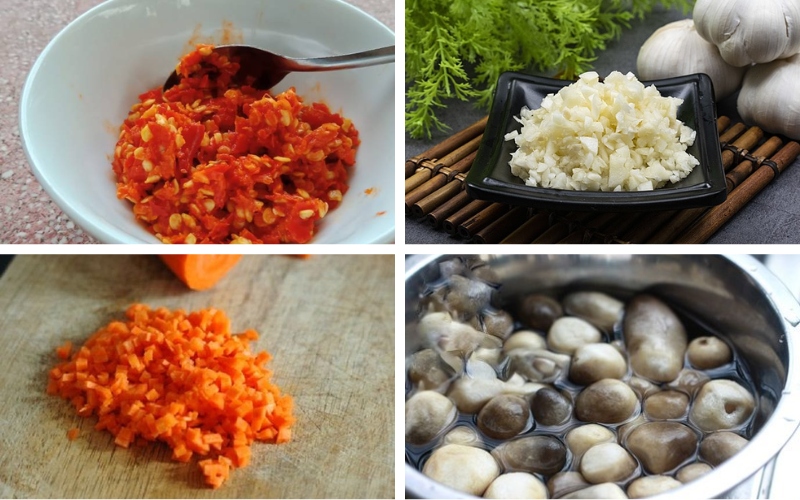 Xay nhuyễn hỗn hợp gồm ớt, tỏi, nấm, cà rốt trong máy xay sinh tố.