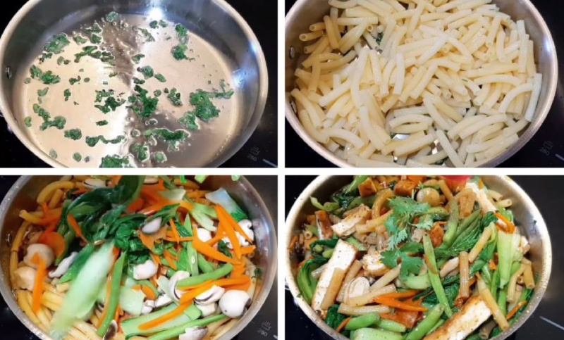 Đặt lại chảo đã chiên đậu hũ lên bếp. Cho một phần nhỏ ngò rí thái nhỏ vào phi thơm. Cho nui đã luộc vào chảo, đảo. Rưới khoảng 1/3 chén nước sốt đã chuẩn bị lên nui, đảo đều cho nui thấm gia vị.
