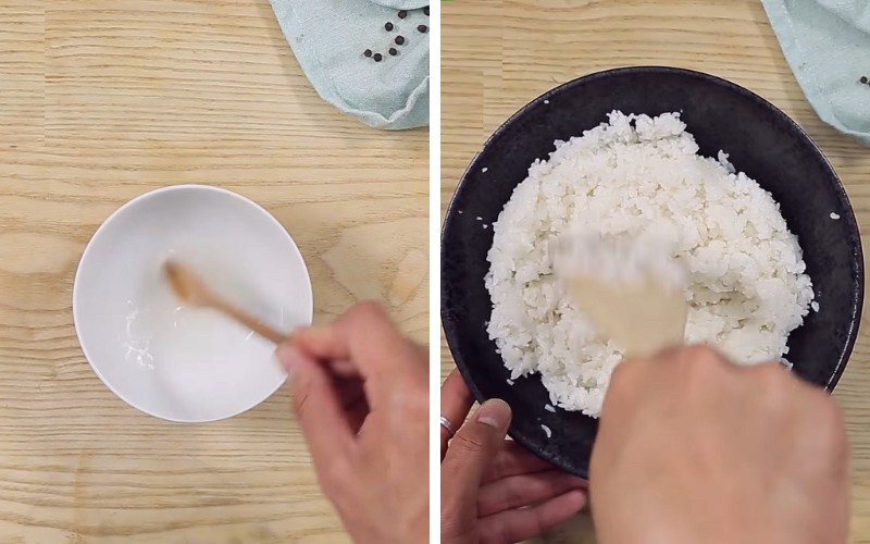 Cho vào chén 2 muỗng cà phê giấm, 1/2 muỗng cà phê muối, trộn đều rồi rưới lên tô cơm và trộn kỹ.