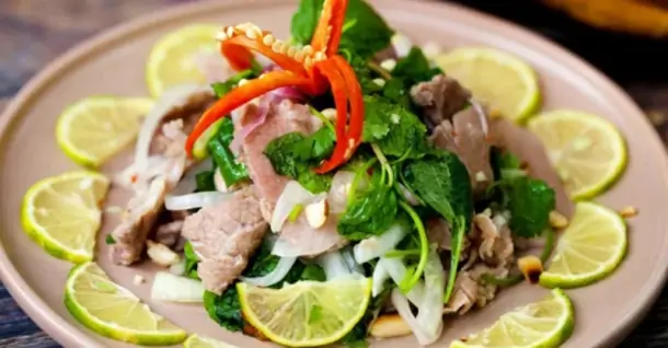 Thịt bò rửa qua nước muối pha loãng để khử mùi và bụi bẩn, sau đó rửa lại bằng nước sạch 1 - 2 lần. Dùng dao sắc thái thịt thành lát mỏng khoảng 0,5cm để dễ ngấm gia vị.