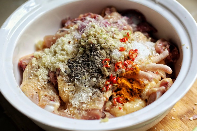Trộn đều và để gà thấm gia vị khoảng 20 - 30 phút. Bạn có thể nhồi một ít sâm và lá ngải cứu vào bụng gà (nếu để nguyên con) để tăng hương vị.
