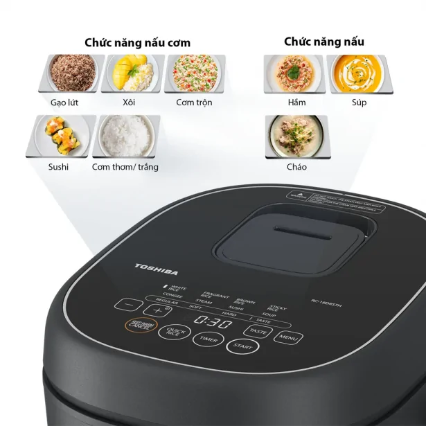 Toshiba RC-18DR4TVN(H) có 8 chương trình nấu được lập trình sẵn, phù hợp với nhiều nhu cầu khác nhau của gia đình: Cơm trắng, cơm gạo lứt, nấu xôi, cơm trộn, sushi, cháo, súp, hấp.