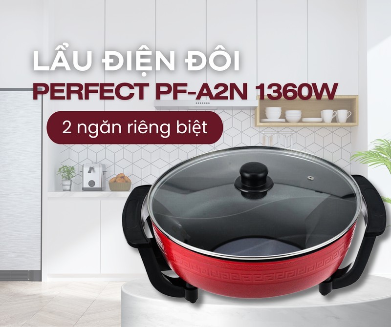 Perfect - Thương hiệu Việt thành lập năm 2000 hiện nay chuyên sản xuất và nhập khẩu các thiết bị nhà bếp như nồi cơm điện, bếp từ, và máy xay sinh tố. Mẫu nồi lẩu điện đôi Perfect PF-A2N 1360W gây ấn tượng với thiết kế hai ngăn riêng biệt, giúp người dùng chế biến hai loại nước lẩu khác nhau trong cùng một lần nấu. Đặc biệt, nồi còn đi kèm nắp kính chịu nhiệt trong suốt và tay cầm cách nhiệt chắc chắn, nhằm hạn chế bị bỏng tay khi sử dụng.