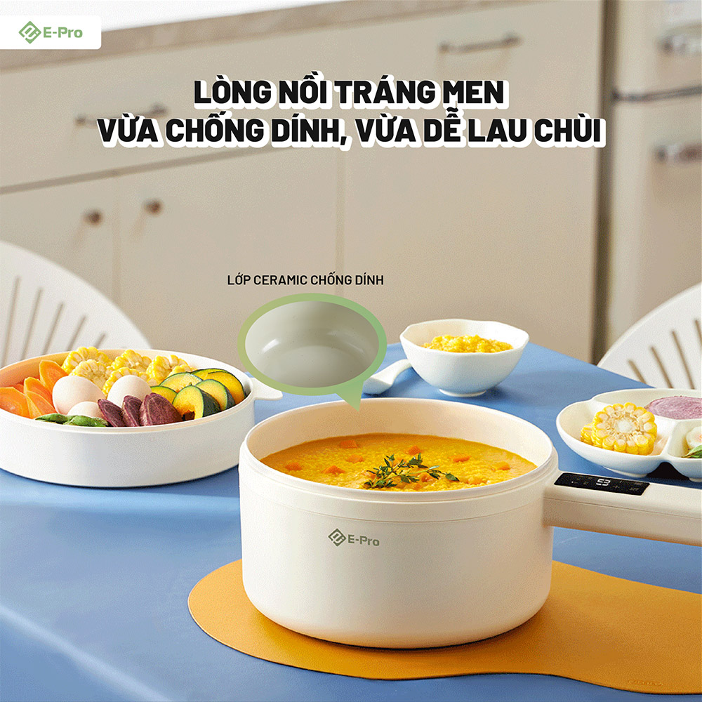 Độ bền của lớp chống dính Ceramic cũng được đánh giá cao, duy trì hiệu quả qua nhiều lần sử dụng. Với nồi điện E-PRO 3.0 Lít VEP-DEC-SD4Z, bạn sẽ tiết kiệm được thời gian và công sức trong cả nấu nướng lẫn dọn dẹp.