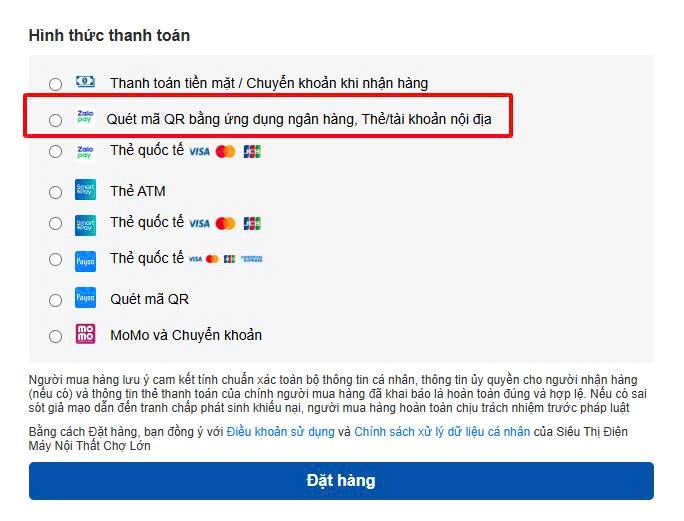 - Khách hàng mua hàng và thực hiện thanh toán qua Zalopay tại chi nhánh Điện Máy Chợ Lớn hoặc website https://dienmaycholon.com/