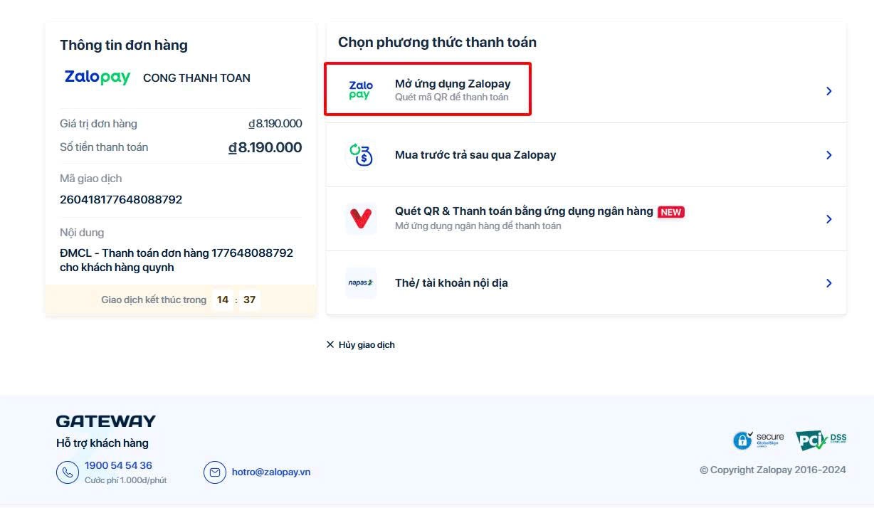 - Bước 2: Lựa chọn phương thức thanh toán quét mã QR Zalopay bằng app Zalopay