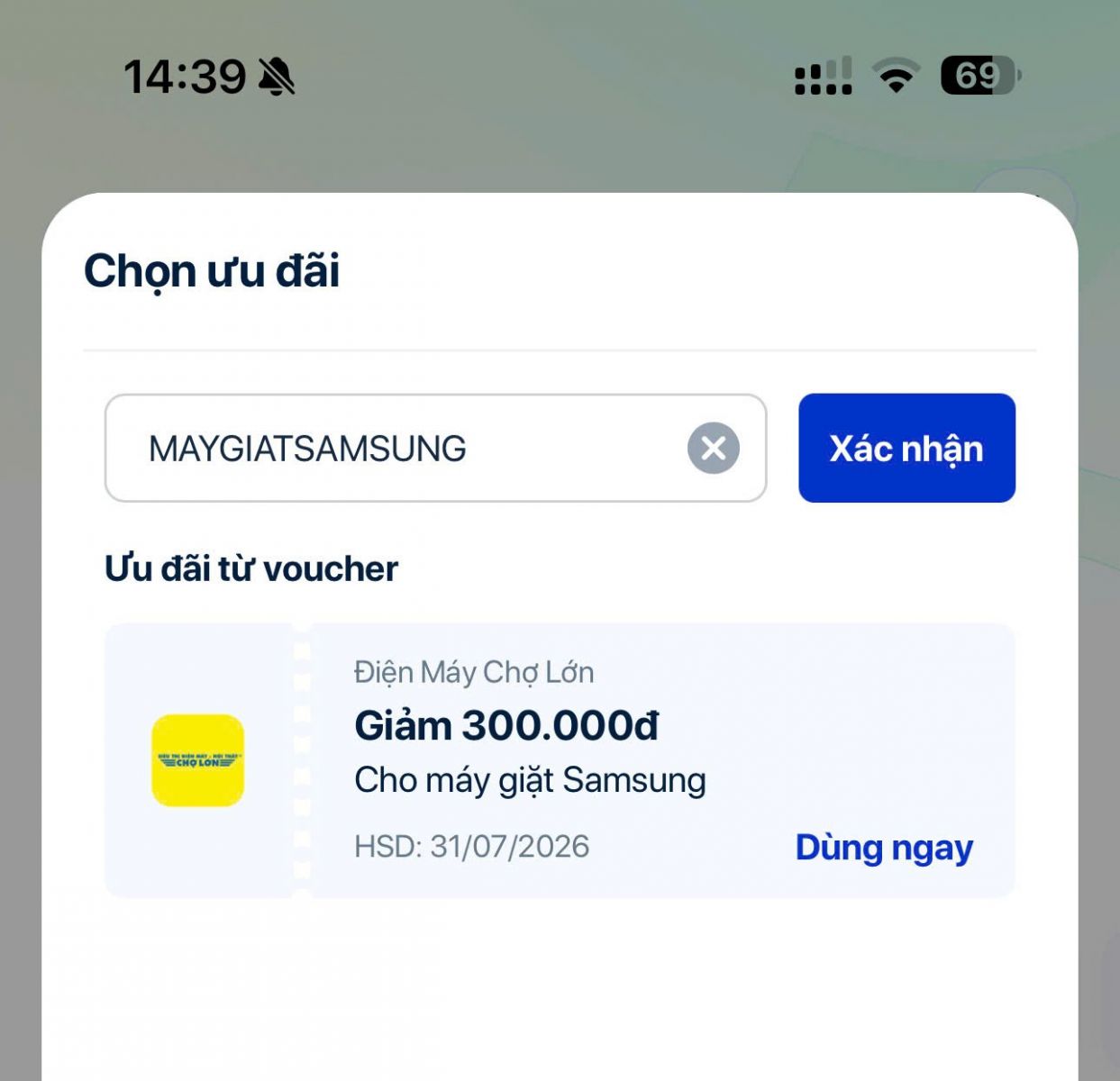 - Bước 3: Mở ứng dụng Zalopay quét mã QR và nhập mã “MAYGIATSAMSUNG” vào phần Mã tự động hiển thị voucher giảm giá theo sản phẩm --> chọn “Dùng ngay”