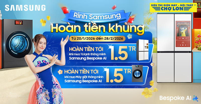Từ ngày 23/01/2026 đến ngày 28/02/2026, ưu đãi dành cho khách hàng Điện Máy Chợ Lớn khi mua sắm sản phẩm Samsung tại website https://dienmaycholon.com