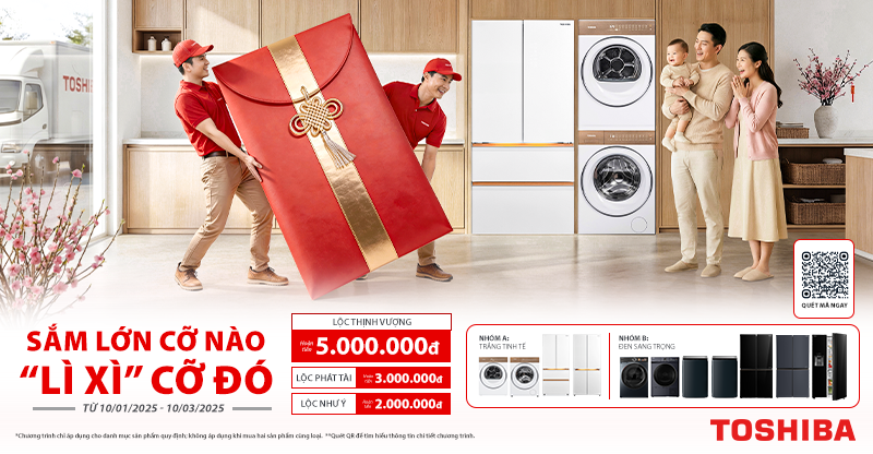 Nhân dịp Tết Nguyên Đán 2026, Công ty TNHH Sản Phẩm Tiêu Dùng Toshiba Việt Nam chính thức triển khai chương trình khuyến mại trên toàn quốc với tên gọi “TOSHIBA SẮM LỚN CỠ NÀO – LÌ XÌ CỠ ĐÓ”, mang đến cơ hội nhận hoàn tiền điện tử hấp dẫn khi mua sắm các sản phẩm Tủ lạnh, Máy giặt, Máy giặt sấy & Máy sấy cao cấp của Toshiba.